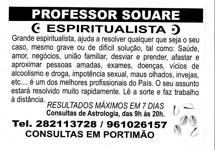 PROFESSOR SOUARE: Grande espiritualista, ajuda a resolver qualquer que seja o seu caso, mesmo grave ou de difícil resolução, tal como: saúde, amor, negócios, união familiar, desviar e prender, afastar e aproximar pessoas amadas, exames, doenças, vícios de alcoolismo e droga, impotência sexual, maus olhados, invejas, etc…. é um dos melhores profissionais do País. O seu assunto estará resolvido muito rapidamente. Lê a sorte e faz trabalhos à distância. Resultados máximos em 7 dias.