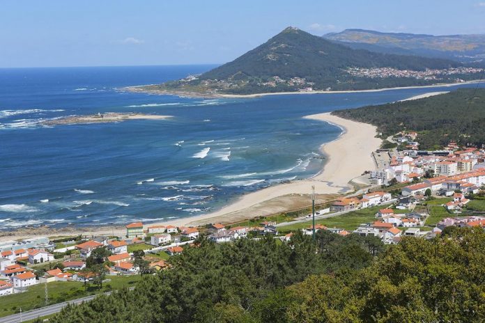 A vila de ruas lajeadas e a igreja de pedra roída pelo ar salgado, com a Galiza em Frente e o fio branco de espuma lá para a barra, parece adormecida e encantada.