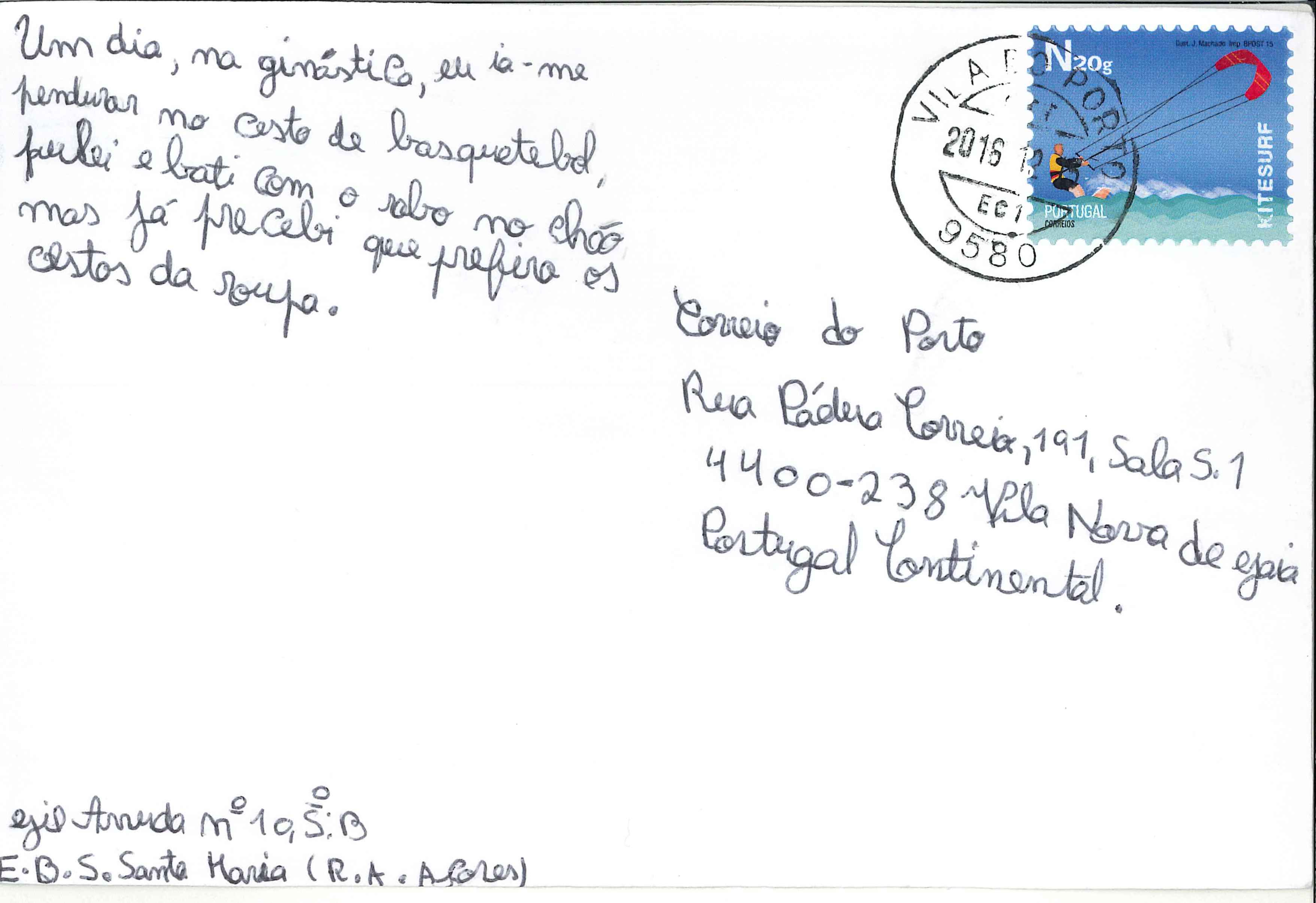 Histórias em Postais O cesto de basquetebol Por Correio do Porto - 23 Dezembro 2016 0 1039 Compartilhar no Facebook Tweet no Twitter Um dia, na ginástica, eu ia-me pendurar no cesto de basquetebol, pulei e bati com o rabo no chão mas já percebi que prefiro os cestos da roupa. Por Gil Arruda, aluno n.º 10, do 5.º B, EBS de Santa Maria, Região Autónoma do Açores, Portugal. Partilha