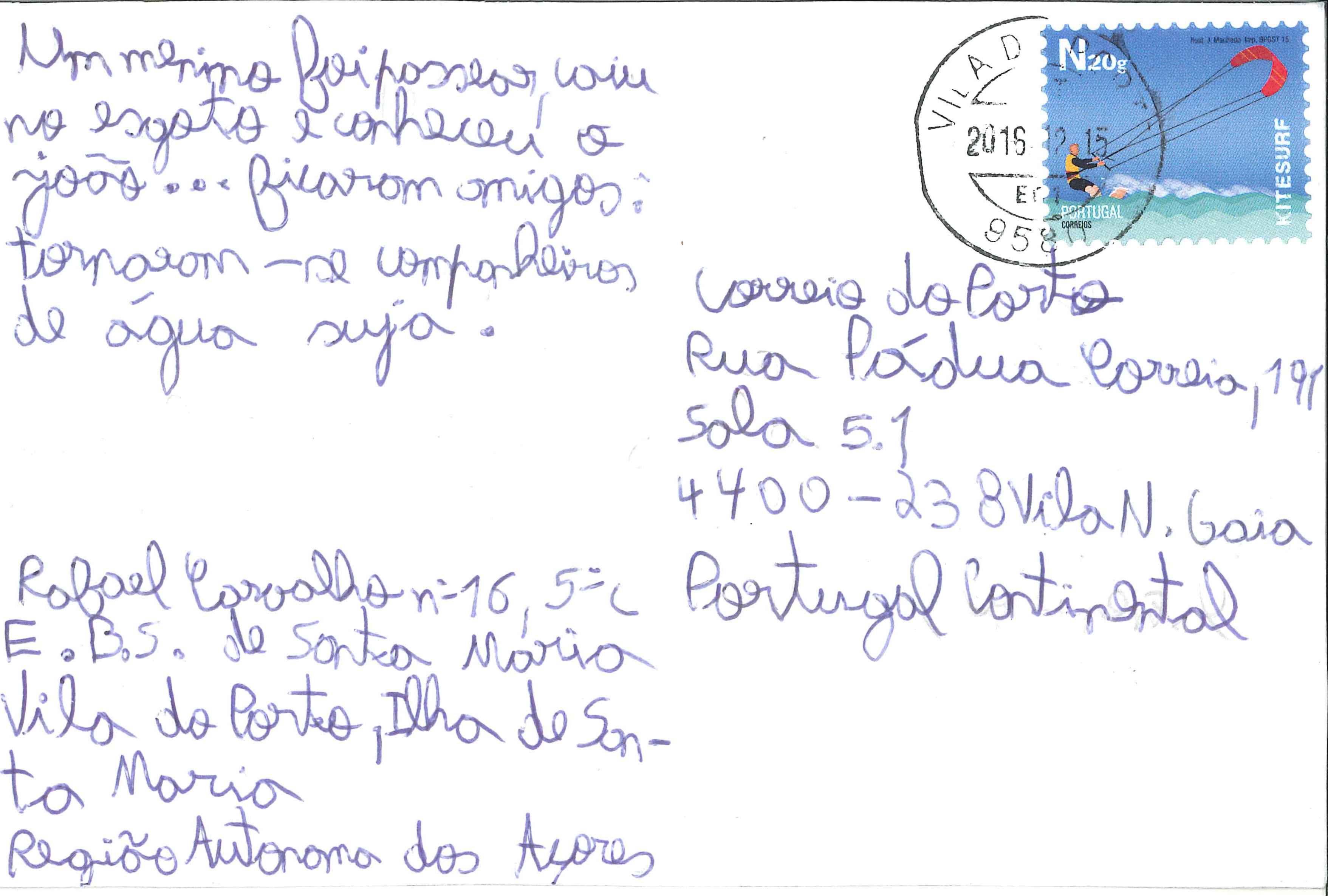 Histórias em Postais O esgosto Por Correio do Porto - 23 Dezembro 2016 0 1007 Compartilhar no Facebook Tweet no Twitter Um menino foi passear, caiu no esgoto e conheceu o João… ficaram amigos: tornaram-se companheiros de água suja. Por Rafael Carvalho, aluno n.º 16, do 5.º C, EBS de Santa Maria, Região Autónoma dos Açores, Portugal. Partilha