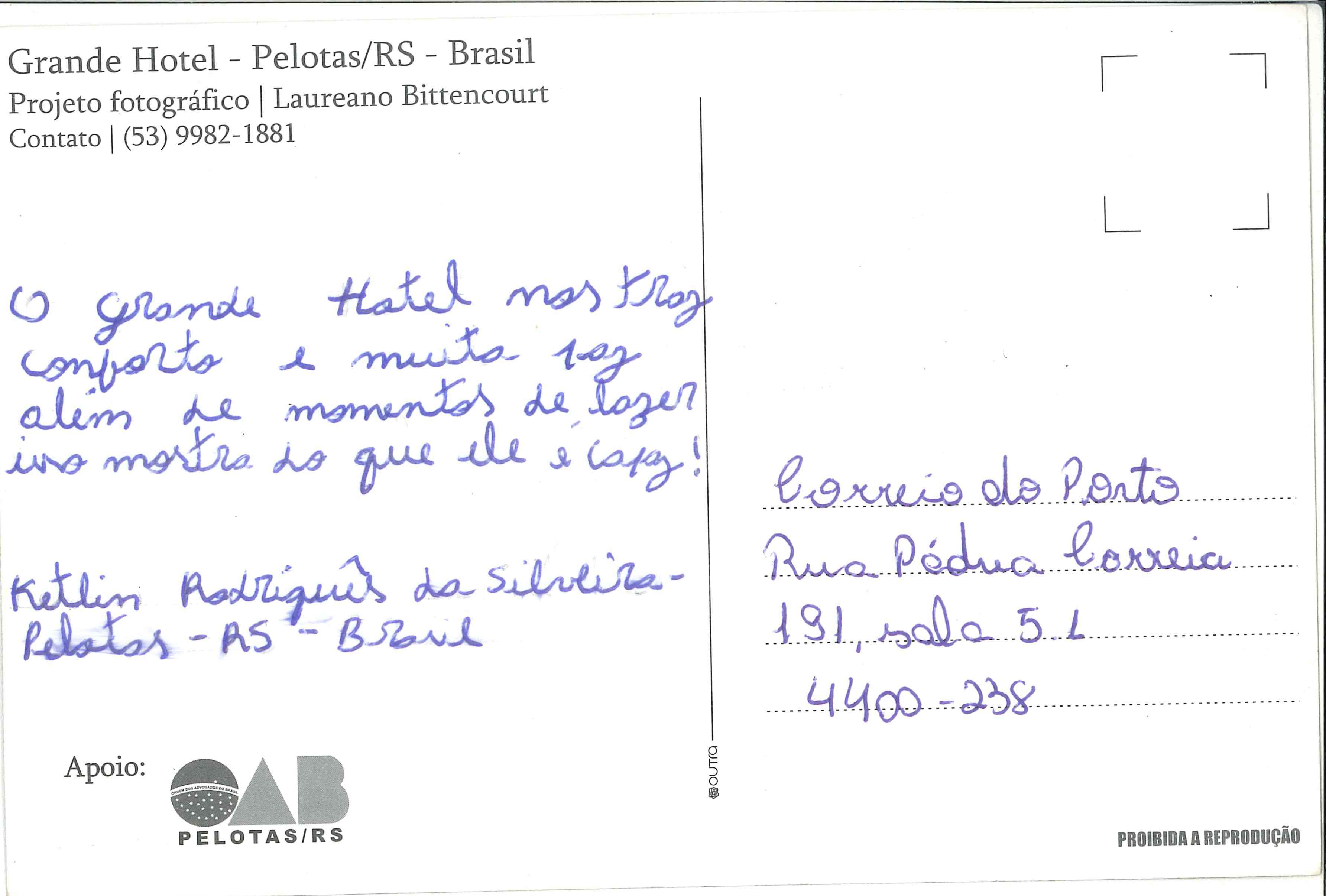 Histórias em Postais O Grande Hotel Por Correio do Porto - 23 Janeiro 2017 0 1059 Compartilhar no Facebook Tweet no Twitter O Grande Hotel nos traz conforto e muita paz além de momentos de lazer isso mostra do que ele é capaz! Por Ketlin Rodrigues da Silveira, que vive em Pelotas, Brasil. Partilha