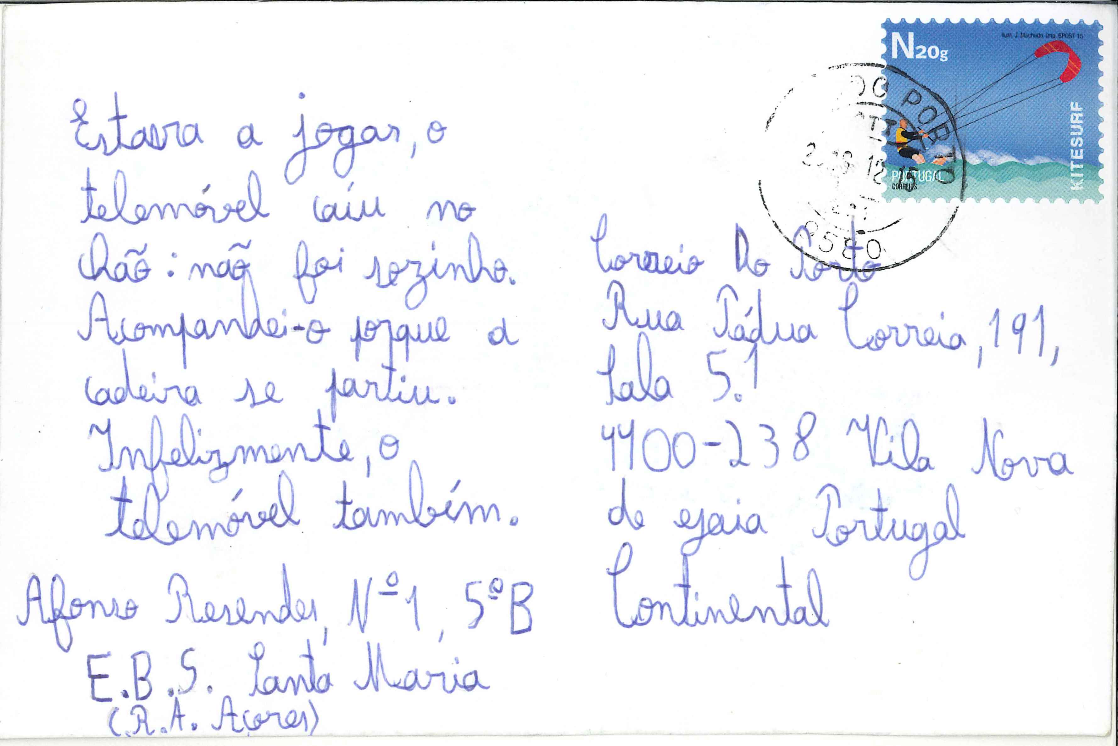 Histórias em Postais O telemóvel Por Correio do Porto - 23 Dezembro 2016 0 1070 Compartilhar no Facebook Tweet no Twitter Estava a jogar, o telemóvel caiu no chão: não foi sozinho. Acompanhei-o porque a cadeira partiu. Infelizmente, o telemóvel também. Por Afonso Resendes, aluno n.º 1, do 5.º B, EBS de Santa Maria, Região Autónoma dos Açores, Portugal. Partilha