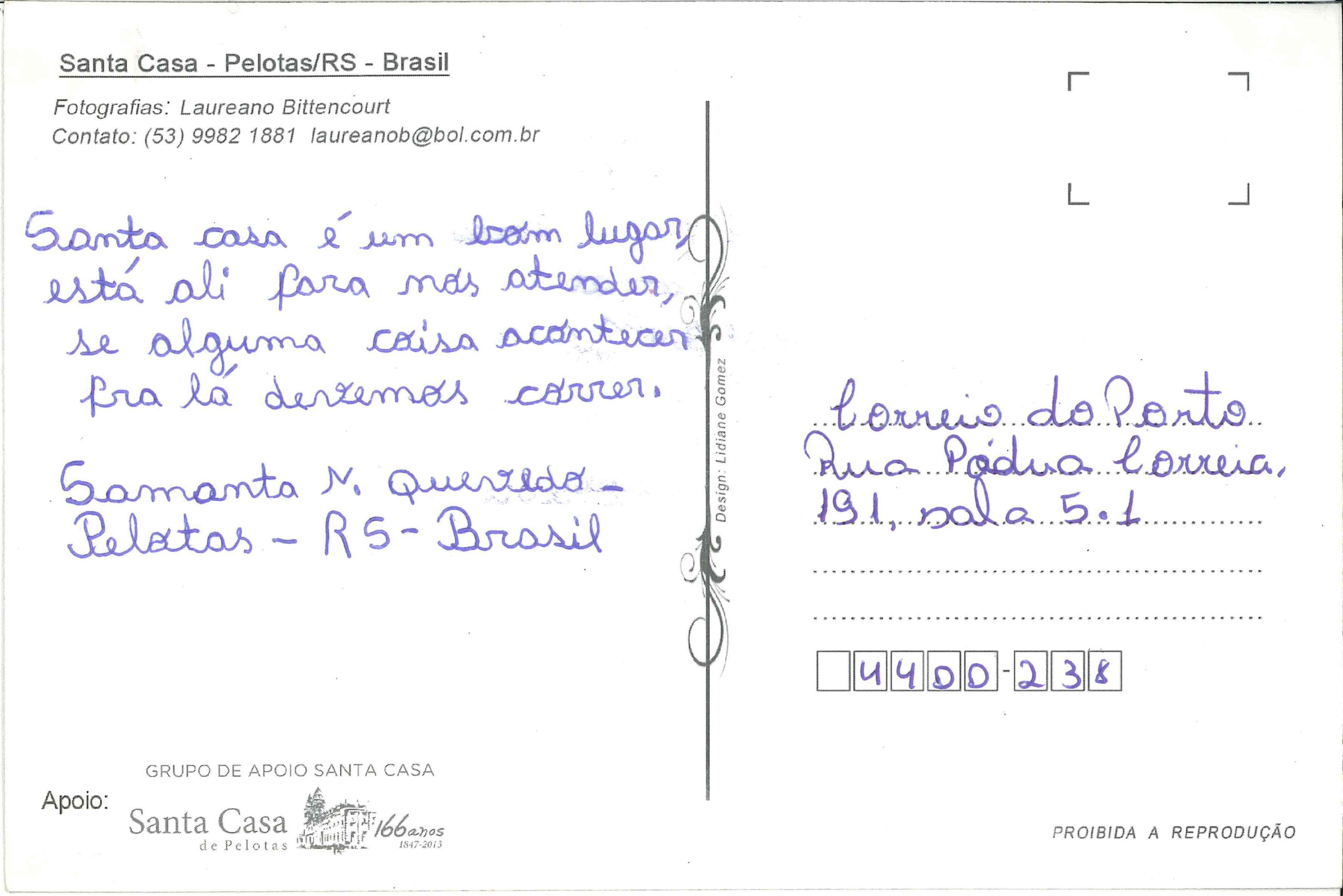 Histórias em Postais Santa Casa é um bom lugar Por Correio do Porto - 23 Janeiro 2017 3 1341 Compartilhar no Facebook Tweet no Twitter Santa Casa é um bom lugar, está ali para nos atender, se alguma coisa acontecer pra lá devemos correr. Por Samanta Quevedo, que vive em Pelots, Brasil. Partilha