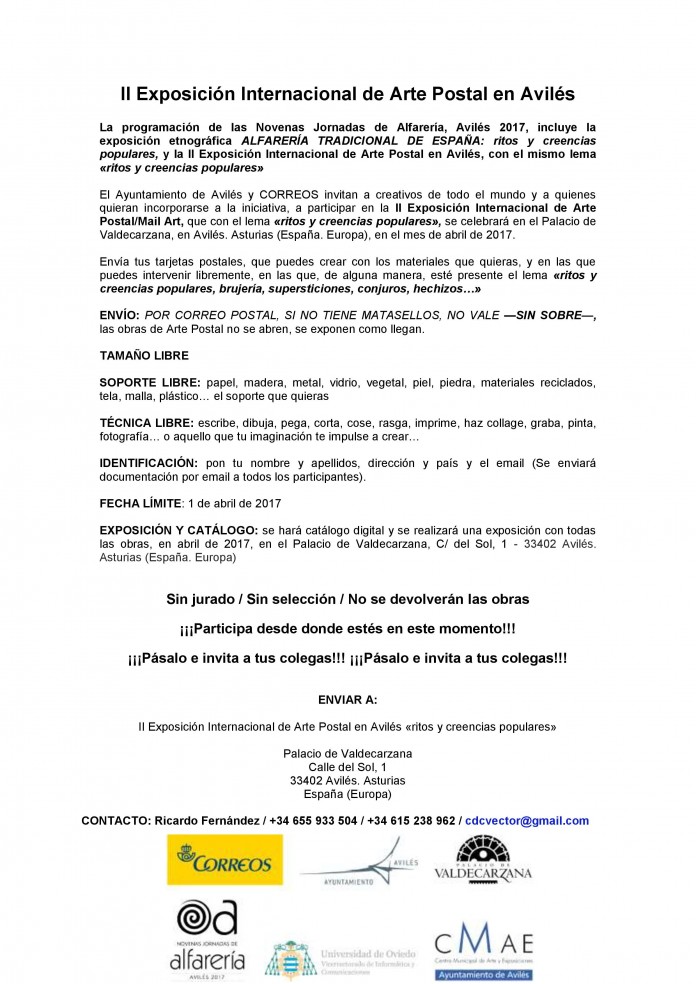 Lugar de Estilo Segunda Exposición Internacional de Arte Postal en Avilés Por Correio do Porto - 23 Novembro 2016 0 1093 Compartilhar no Facebook Tweet no Twitter Publicado por Ayuntamiento de Avilés Partilha