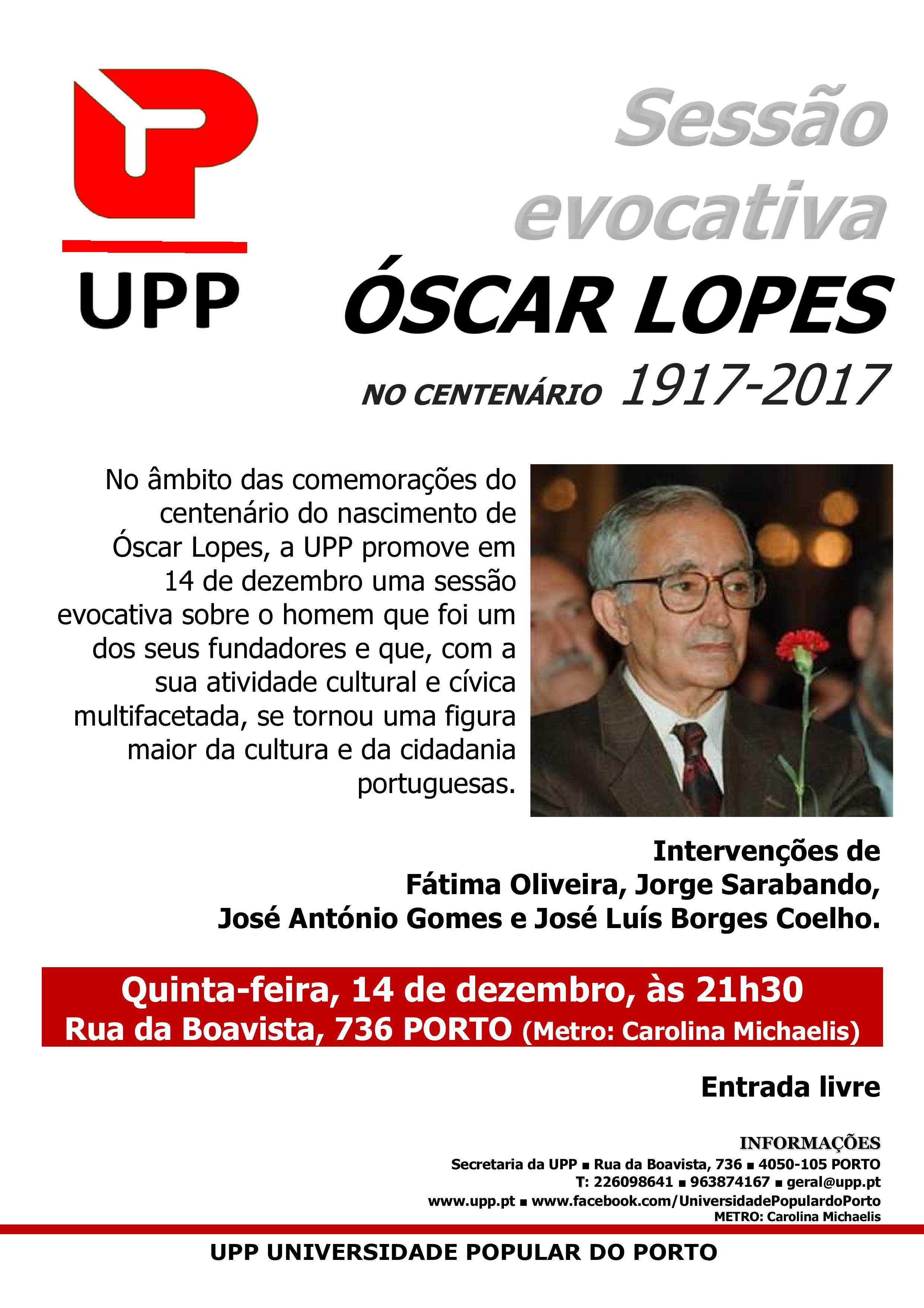 Lugar de Estilo Sessão evocativa Óscar Lopes (1917-2017) Por Correio do Porto - 4 Dezembro 2017 0 1141 Compartilhar no Facebook Tweet no Twitter Publicado por Universidade Popular do Porto Partilha