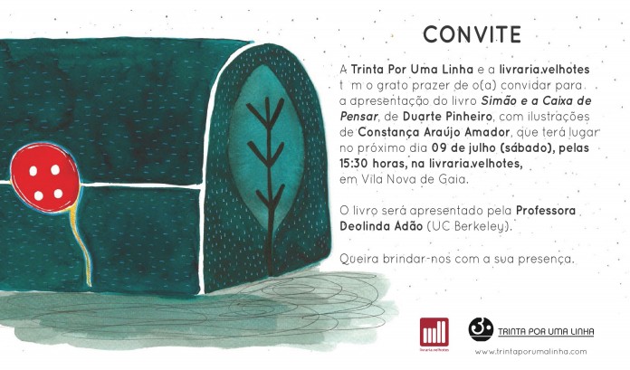 A Editora Trinta Por Uma Linha e a livraria.velhotes têm o grato prazer de o(a) convidar para a apresentação do livro Simão e a Caixa de Pensar, de Duarte Pinheiro, com ilustrações de Constança Araújo Amador, que terá lugar no próximo dia 09 de julho (sábado), pelas 15:30 horas, na livraria.velhotes, em Vila Nova de Gaia.