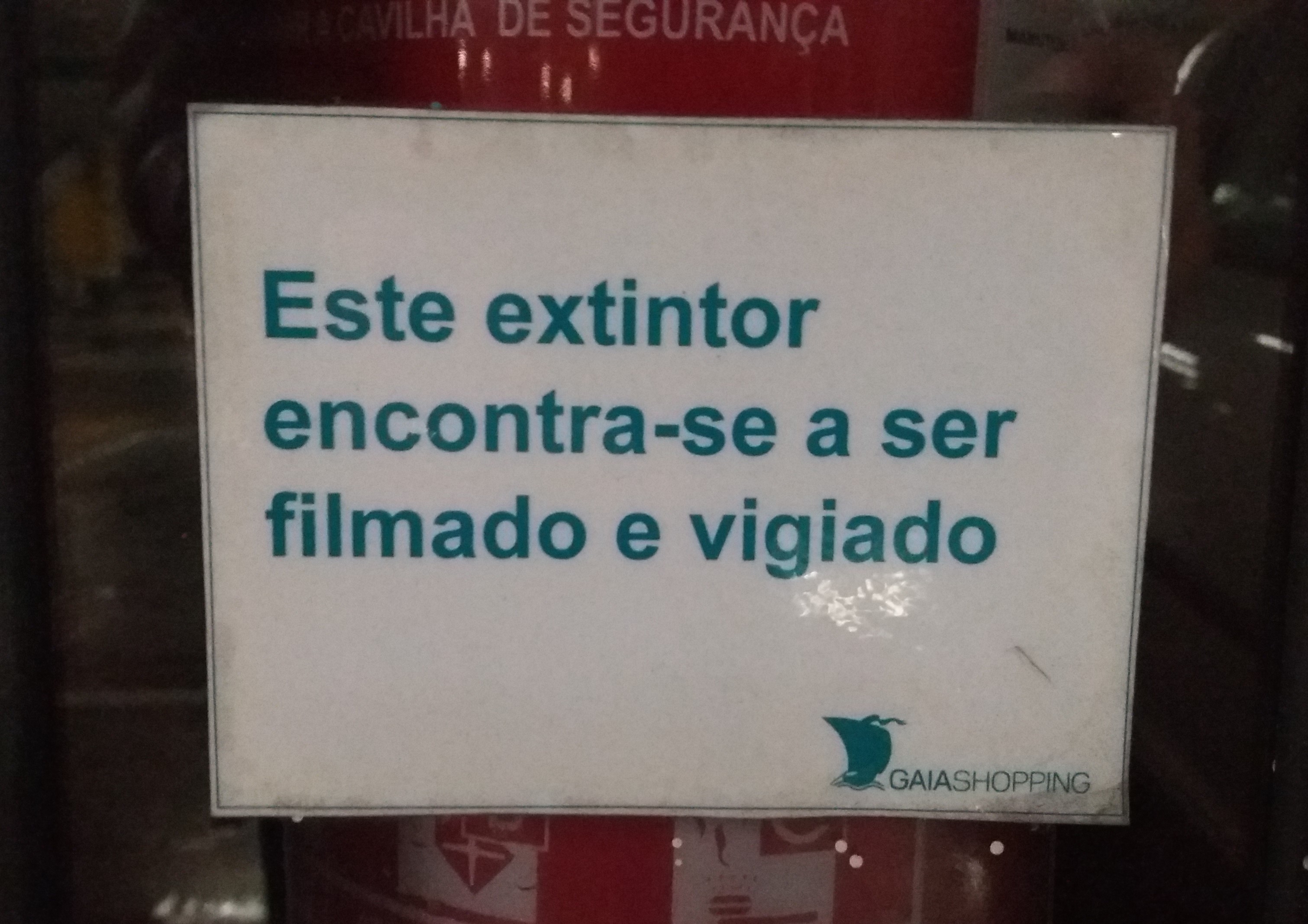 Lugares-comuns Lugares-comuns (134) Por Correio do Porto - 25 Janeiro 2020 0 731 Compartilhar no Facebook Tweet no Twitter – Este extintor encontra-se a ser filmado e vigiado Aviso afixado em extintor da garagem subterrânea do Gaiashopping Partilha