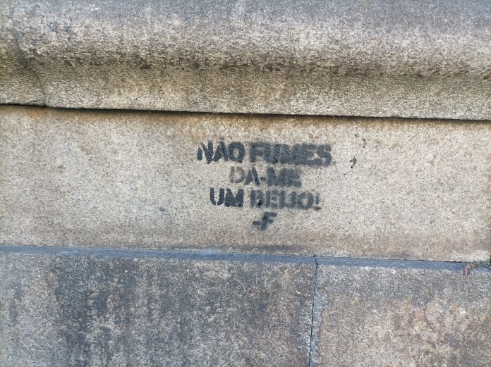 Lugares-comuns Lugares-comuns (202) Por Correio do Porto - 16 Agosto 2022 0 518 Compartilhar no Facebook Tweet no Twitter Não fumes dá-me um beijo! -F inscrito no muro do Colégio Nossa Senhora Bonança, em Vila Nova de Gaia Partilha