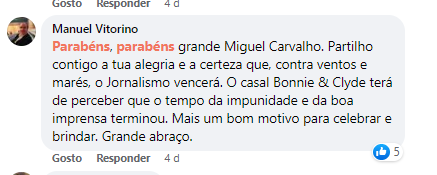 – Manuel Vitorino: Parabéns, parabéns grande Miguel Carvalho. Partilho contigo a tua alegria e a certeza que, contra ventos e marés, o Jornalismo vencerá. O casal Bonnie & Clyde terá de perceber que o tempo da impunidade e da boa imprensa terminou. Mais um bom motivo para celebrar e brindar. Grande abraço.