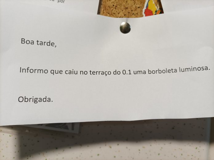Lugares-comuns Lugares-comuns (216) Por Correio do Porto - 21 Dezembro 2022 0 447 Compartilhar no Facebook Tweet no Twitter – Boa tarde, Informo que caiu no terraço do 0.1 uma borboleta luminosa. Obrigada. afixado num placard do hall de entrada de um edifício em Vila Nova Gaia Partilha