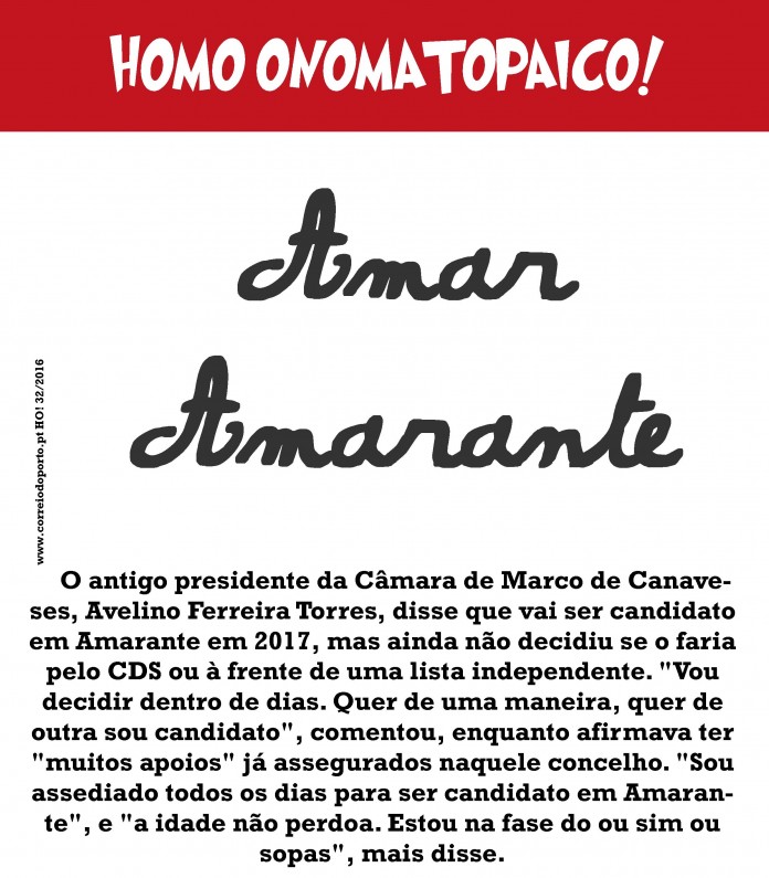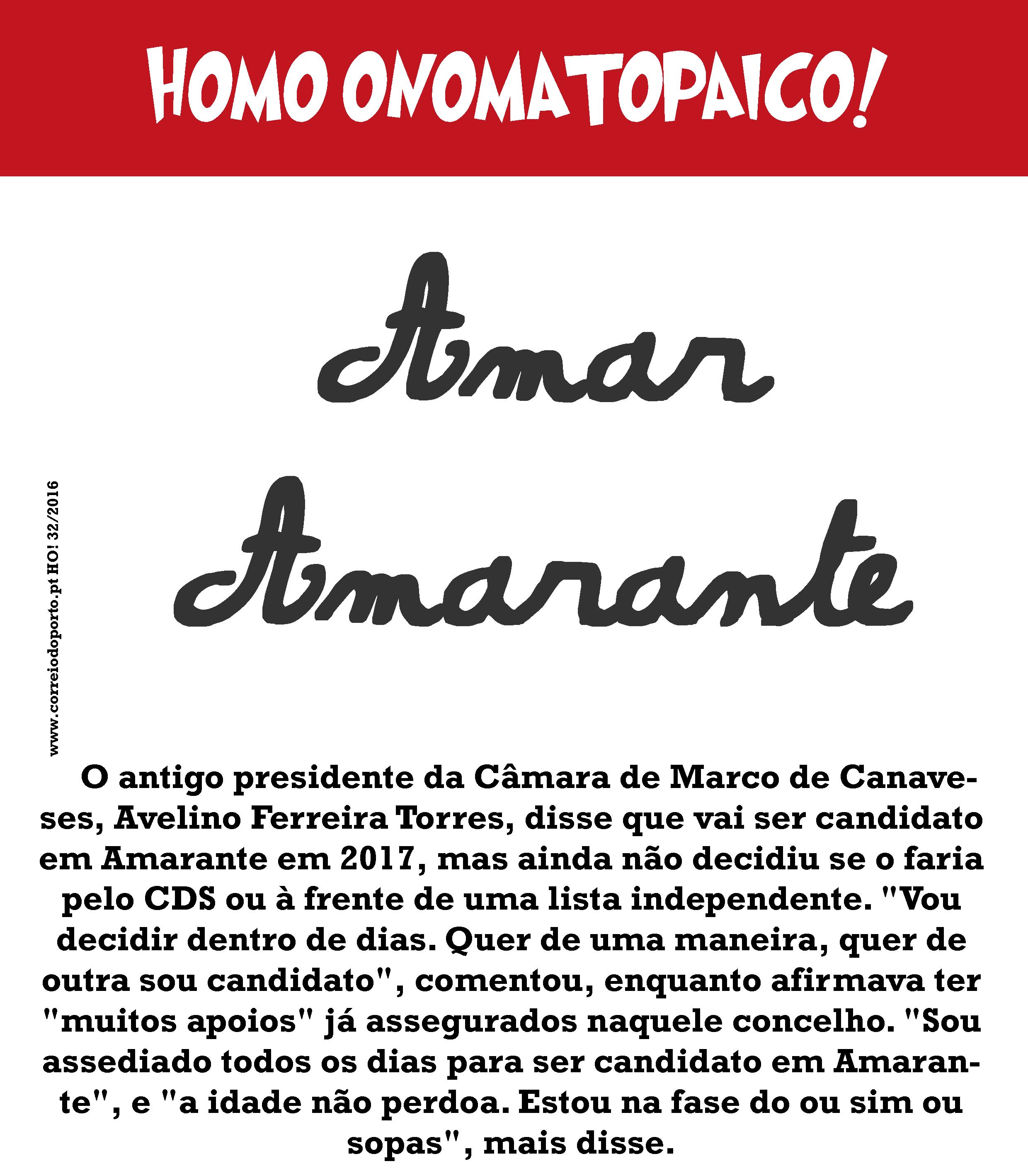 NOTÍCIA: O antigo presidente da Câmara de Marco de Canaveses, Avelino Ferreira Torres, disse que vai ser candidato em Amarante em 2017, mas ainda não decidiu se o faria pelo CDS ou à frente de uma lista independente. “Vou decidir dentro de dias. Quer de uma maneira, quer de outra sou candidato”, comentou, enquanto afirmava ter “muitos apoios” já assegurados naquele concelho. “Sou assediado todos os dias para ser candidato em Amarante”, e “a idade não perdoa. Estou na fase do ou sim ou sopas”, mais disse. Homo Onomatopaico: Amar Amarante!