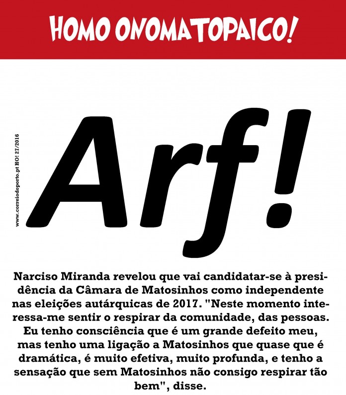 NOTÍCIA: Narciso Miranda revelou que vai candidatar-se à presidência da Câmara de Matosinhos como independente nas eleições autárquicas de 2017. “Neste momento interessa-me sentir o respirar da comunidade, das pessoas. Eu tenho consciência que é um grande defeito meu, mas tenho uma ligação a Matosinhos que quase que é dramática, é muito efetiva, muito profunda, e tenho a sensação que sem Matosinhos não consigo respirar tão bem”, disse. Homo Onomatopaico: Arf!