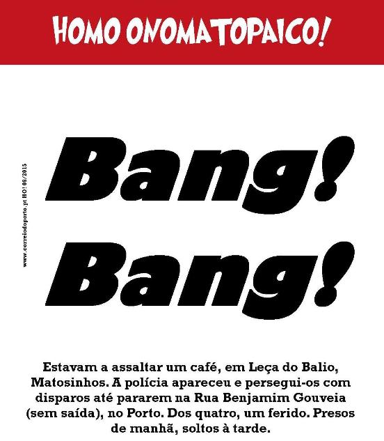 NOTÍCIA: Estavam a assaltar um café, em Leça do Balio, Matosinhos. A polícia apareceu e persegui-os com disparos até pararem na Rua Benjamim Gouveia (sem saída), no Porto. Dos quatro, um ferido. Presos de manhã, soltos à tarde. Homo Onomatopaico: Bang! Bang!