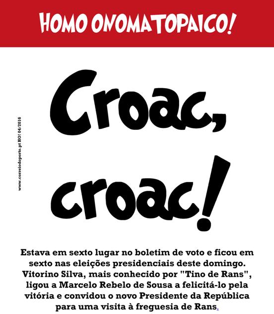 NOTÍCIA: Estava em sexto lugar no boletim de voto e ficou em sexto nas eleições presidenciais deste domingo. Vitorino Silva, mais conhecido por “Tino de Rans”, ligou a Marcelo Rebelo de Sousa a felicitá-lo pela vitória e convidou o novo Presidente da República para uma visita à freguesia de Rans. Homo Onomatopaico: Croac, croac!
