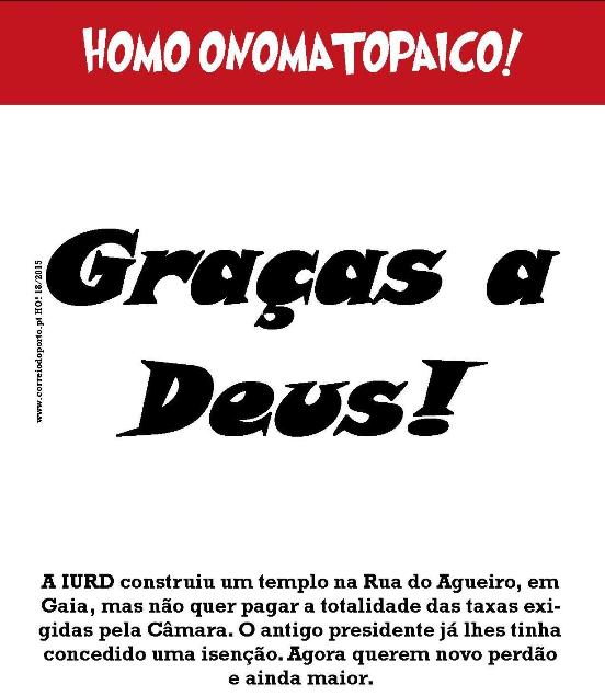 NOTÍCIA: A IURD construiu um templo na Rua do Agueiro, em Gaia, mas não quer pagar a totalidade das taxas exigidas pela Câmara. O antigo presidente já lhes tinha concedido uma isenção. Agora querem novo perdão e ainda maior. Homo Onomatopaico: Graças a Deus!