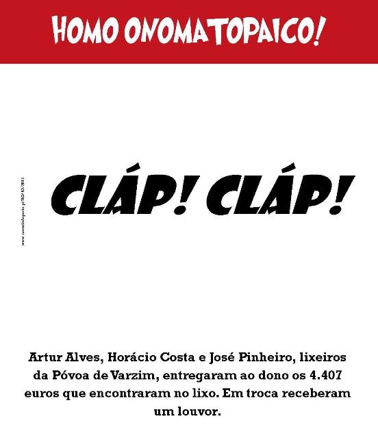 NOTÍCIA: Artur Alves, Horácio Costa e José Pinheiro, lixeiros da Póvoa de Varzim, entregaram ao dono os 4.407 euros que encontraram no lixo. Em troca receberam um louvor. Homo Onomatopaico: CLÁP! CLÁP!
