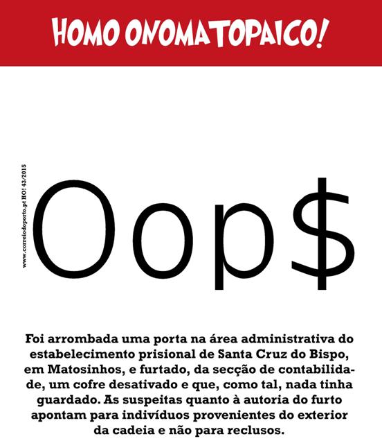NOTÍCIA: Foi arrombada uma porta na área administrativa do estabelecimento prisional de Santa Cruz do Bispo, em Matosinhos, e furtado, da secção de contabilidade, um cofre desativado e que, como tal, nada tinha guardado. As suspeitas quanto à autoria do furto apontam para indivíduos provenientes do exterior da cadeia e não para reclusos. Homo Onomatopaico: Oop$!