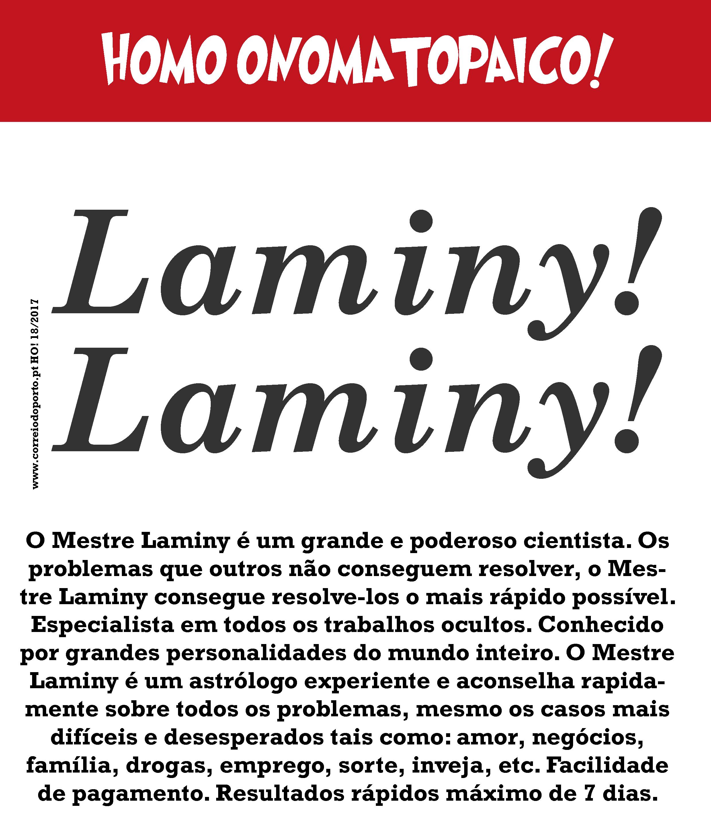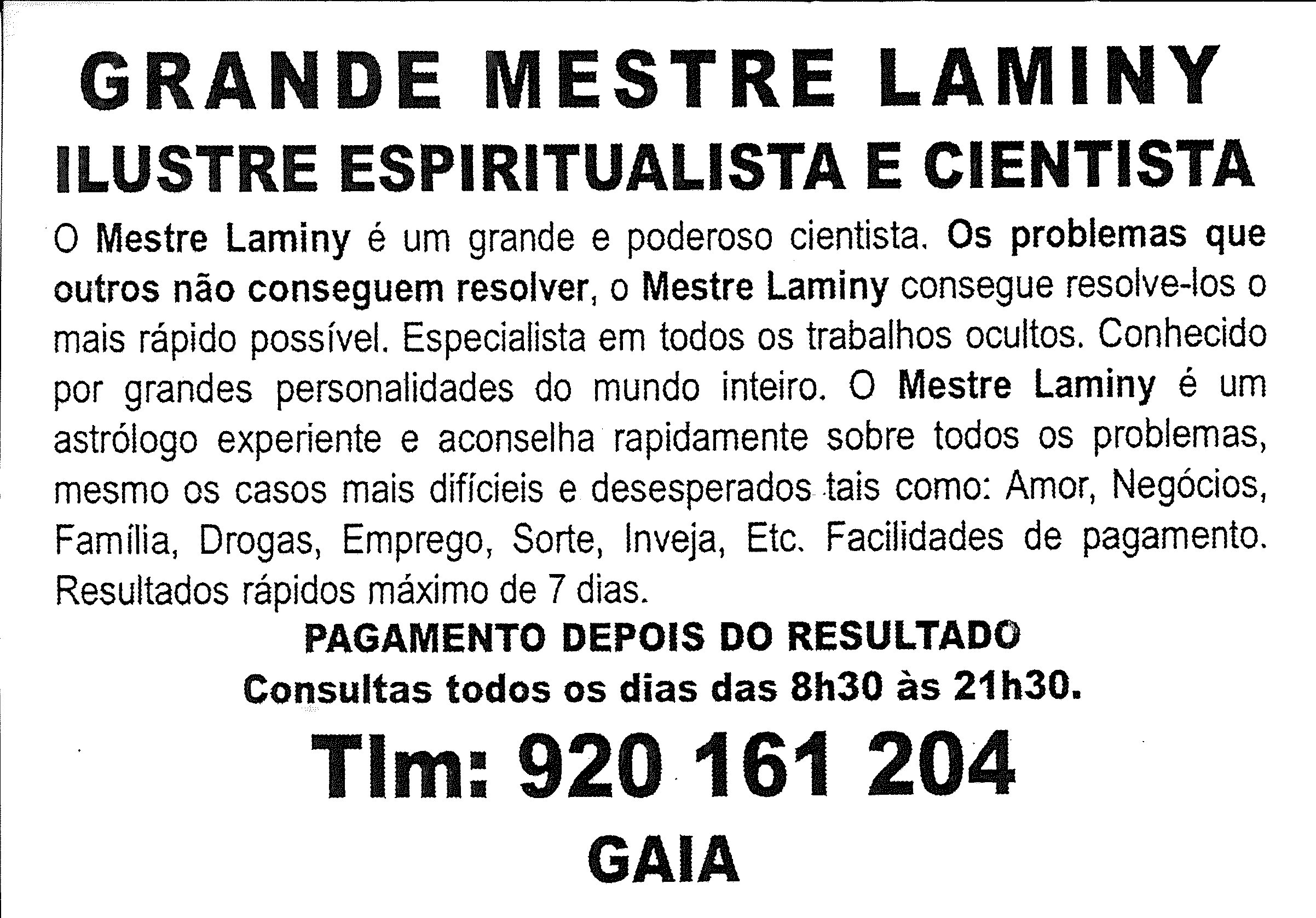 ANÚNCIO: O Mestre Laminy é um grande e poderoso cientista. Os problemas que outros não conseguem resolver, o Mestre Laminy consegue resolve-los o mais rápido possível. Especialista em todos os trabalhos ocultos. Conhecido por grandes personalidades do mundo inteiro. O Mestre Laminy é um astrólogo experiente e aconselha rapidamente sobre todos os problemas, mesmo os casos mais difíceis e desesperados tais como: amor, negócios, família, drogas, emprego, sorte, inveja, etc. Facilidade de pagamento. Resultados rápidos máximo de 7 dias. Homo Onomatopaico: Laminy! Laminy!
