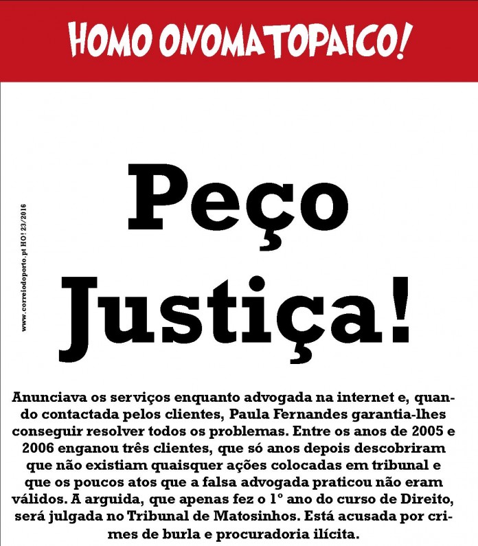 NOTÍCIA: Anunciava os serviços enquanto advogada na internet e, quando contactada pelos clientes, Paula Fernandes garantia-lhes conseguir resolver todos os problemas. Entre os anos de 2005 e 2006 enganou três clientes, que só anos depois descobriram que não existiam quaisquer ações colocadas em tribunal e que os poucos atos que a falsa advogada praticou não eram válidos. A arguida, que apenas fez o 1º ano do curso de Direito, será julgada no Tribunal de Matosinhos. Está acusada por crimes de burla e procuradoria ilícita. Homo Onomatopaico: Peço justiça!
