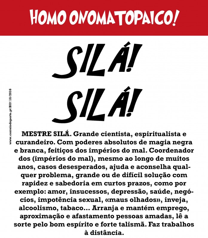 ANÚNCIO: MESTRE SILÁ. Grande cientista, espiritualista e curandeiro. Com poderes absolutos de magia negra e branca, feitiços dos impérios do mal. Coordenador dos (impérios do mal), mesmo ao longo de muitos anos, casos desesperados, ajuda e aconselha qualquer problema, grande ou de difícil solução com rapidez e sabedoria em curtos prazos, como por exemplo: amor, insucessos, depressões, saúde, negócios, impotência sexual, «maus olhados», inveja, alcoolismo, tabaco… Arranja e mantém emprego, aproximação e afastamento pessoas amadas, lê a sorte pelo bom espírito e forte talismã. Faz trabalhos à distância. Homo Onomatopaico: Silá! Silá!