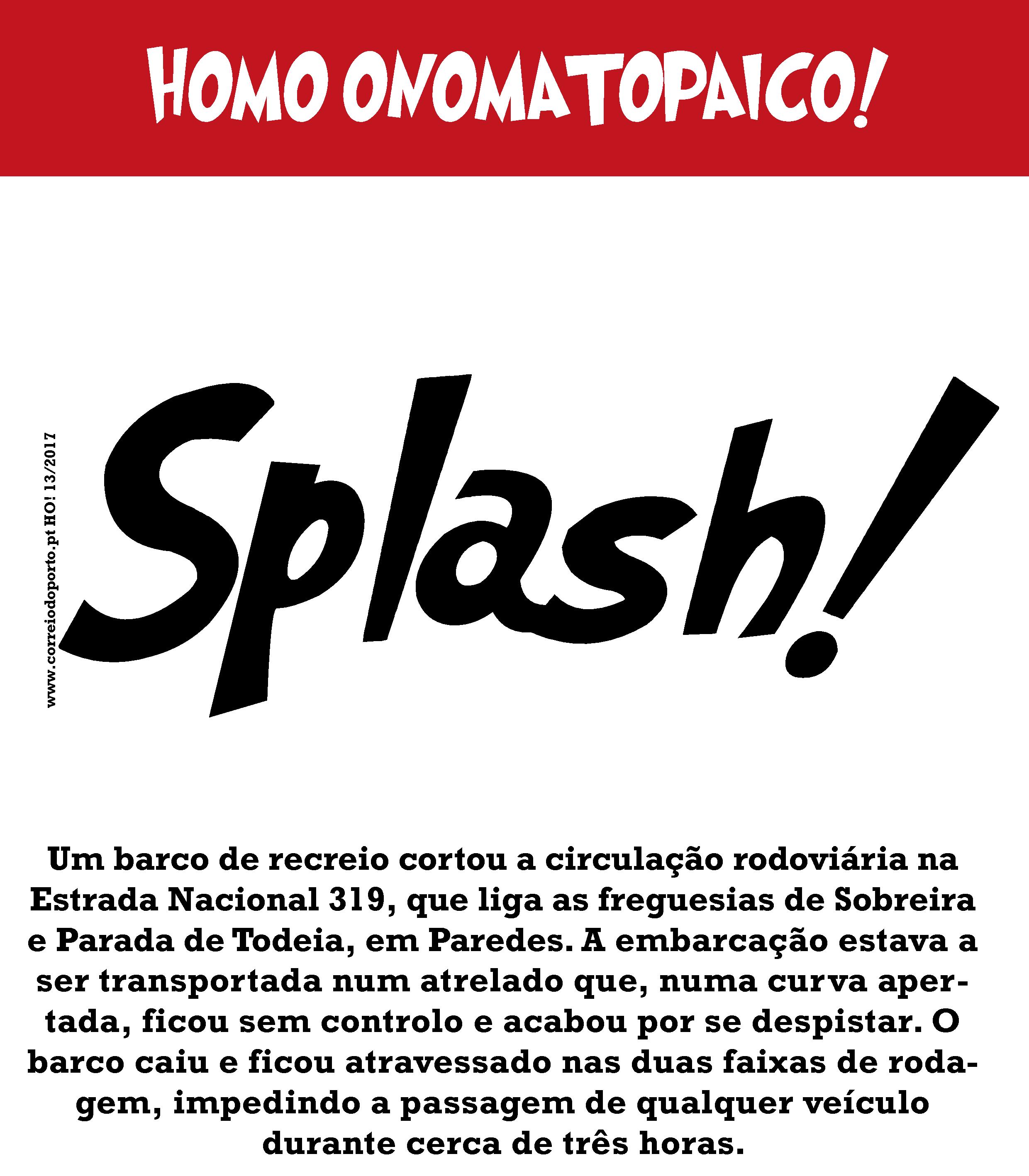 NOTÍCIA: Um barco de recreio cortou a circulação rodoviária na Estrada Nacional 319, que liga as freguesias de Sobreira e Parada de Todeia, em Paredes. A embarcação estava a ser transportada num atrelado que, numa curva apertada, ficou sem controlo e acabou por se despistar. O barco caiu e ficou atravessado nas duas faixas de rodagem, impedindo a passagem de qualquer veículo durante cerca de três horas. Homo Onomatopaico: Splash!