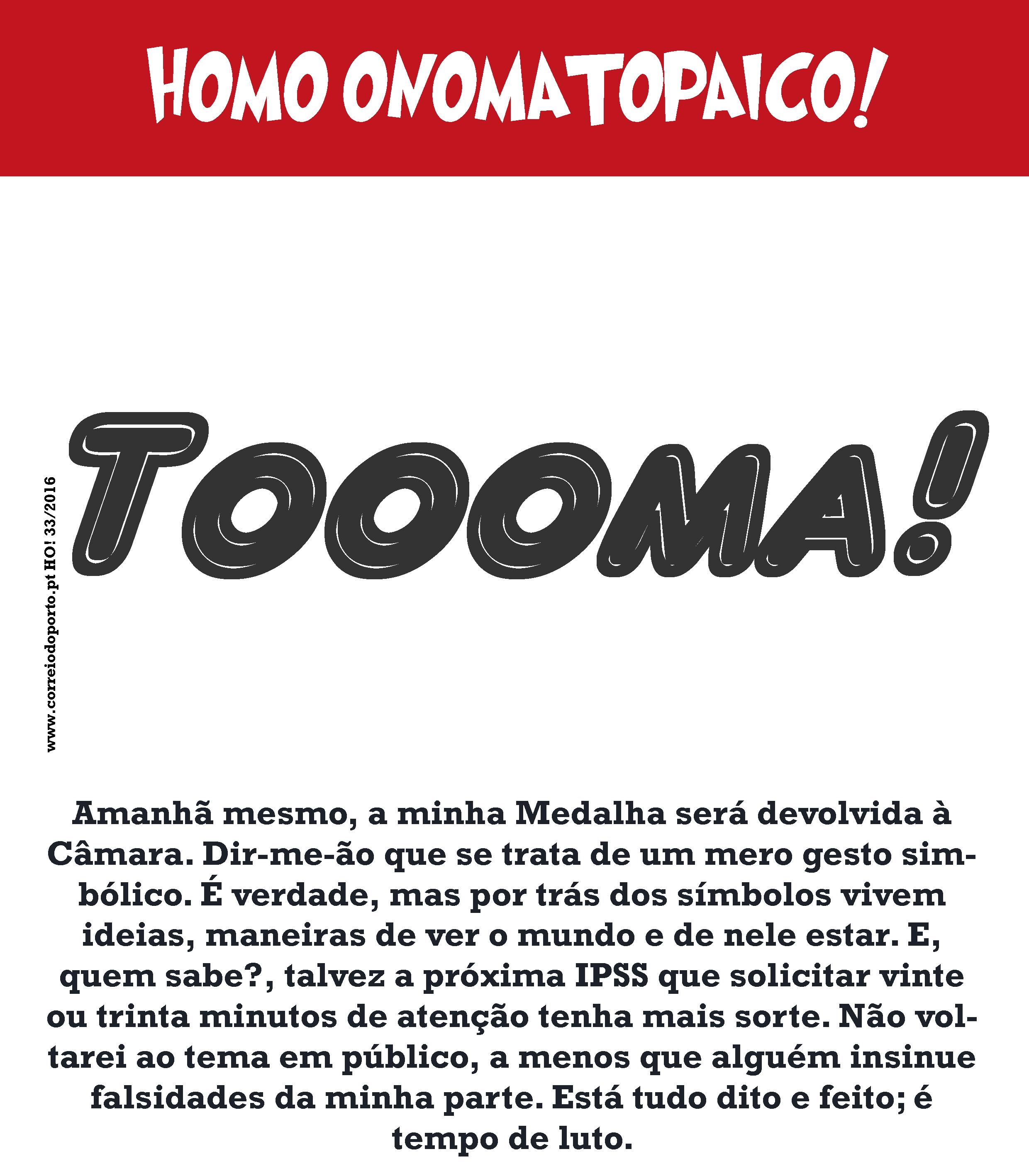 ANÚNCIO DE JÚLIO MACHADO VAZ: Amanhã mesmo, a minha Medalha será devolvida à Câmara. Dir-me-ão que se trata de um mero gesto simbólico. É verdade, mas por trás dos símbolos vivem ideias, maneiras de ver o mundo e de nele estar. E, quem sabe?, talvez a próxima IPSS que solicitar vinte ou trinta minutos de atenção tenha mais sorte. Não voltarei ao tema em público, a menos que alguém insinue falsidades da minha parte. Está tudo dito e feito; é tempo de luto. Homo Onomatopaico: Toooma!