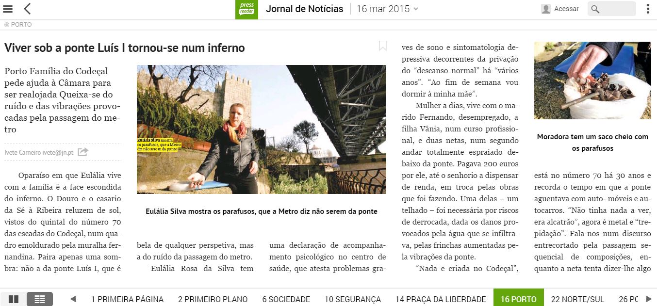 NOTÍCIA: Eulália Silva (Lala para os amigos) não aguenta viver debaixo da ponte Luís I. Anda na psicóloga para tratar mazelas causadas pelo barulho do metro e diz que tem o lar desfeito pela vibração. Pediu ajuda à Câmara do Porto. Homo Onomatopaico: Tum Tum! Tum Tum! Tum Tum!