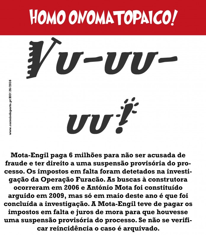 NOTÍCIA: Mota-Engil paga 6 milhões para não ser acusada de fraude e ter direito a uma suspensão provisória do processo. Os impostos em falta foram detetados na investigação da Operação Furacão. As buscas à construtora ocorreram em 2006 e António Mota foi constituído arguido em 2009, mas só em maio deste ano é que foi concluída a investigação. A Mota-Engil teve de pagar os impostos em falta e juros de mora para que houvesse uma suspensão provisória do processo. Se não se verificar reincidência o caso é arquivado. Homo Onomatopaico: Vu-uu-uu!