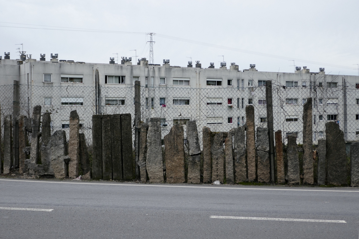 A cerca feita de pedregulhos em forma de poste e de outros postes de betão saídos de outras tecnologias e materiais, mais o encastelamento de apartamentos em bloco tristonho e desencantado a precisar de pintura, atiram o imaginário para a cena do condomínio fechado da idade da pedra revista e actualizada.