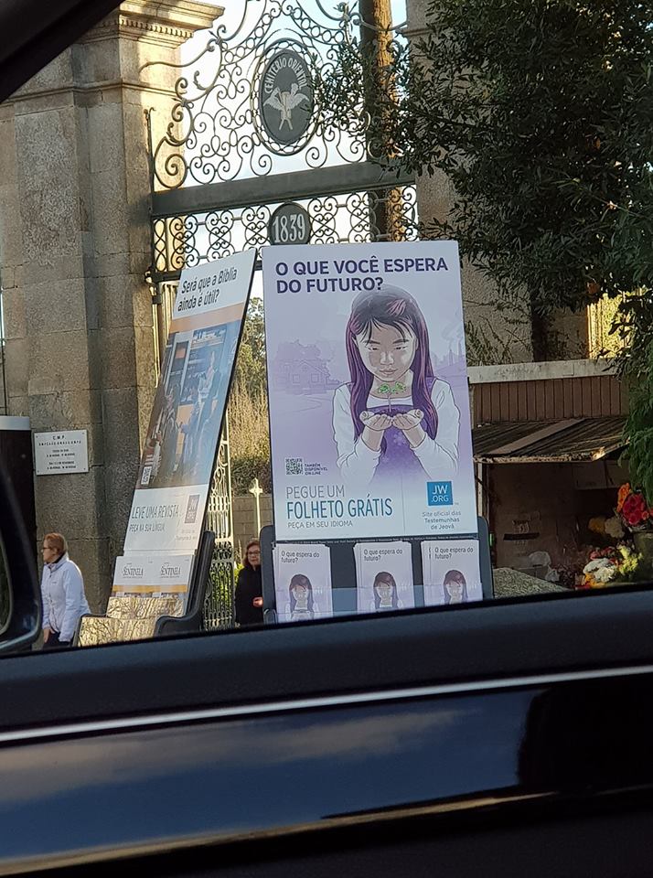 Pergunta inscrita em cartaz das Testemunhas de Jeová exibido à entrada de um cemitério no Porto.
