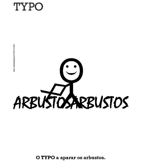 MEMÓRIA descritiva: Parece que o TYPO gosta dos arbustos aparados. Temos então o TPYO munido de uma tesoura, ou melhor, de um X[1] em fonte Arial e tamanho 70. Os arbustos estão todos crescidos, daí estarem em maiúsculas. São da espécie Mistral e têm o tamanho 70. Bom trabalho TYPO! No fim da caixa temos a legenda: O TYPO a aparar os arbustos. da autoria de PML.
