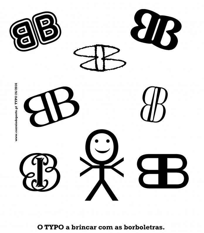 MEMÓRIA descritiva: O mundo dos insetos é muito variado. De entre as diversas espécies de insetos, o TYPO tem predileção pelas borboletas. São animais tipográficos porque feitos de dois BB. Talvez se devessem chamar borboletras. Hoje o TYPO está rodeado de sete borboletras da categoria: AR DELANEY; AR JULIAN; Bradley Hand ITC; Times New Roman; Juice ITC; Harrington e Arial. No fim da caixa temos a legenda: O TYPO a brincar com as borboletras. da autoria de PML, inspirado no poema visual de Alexandre Brito, Borboletra.