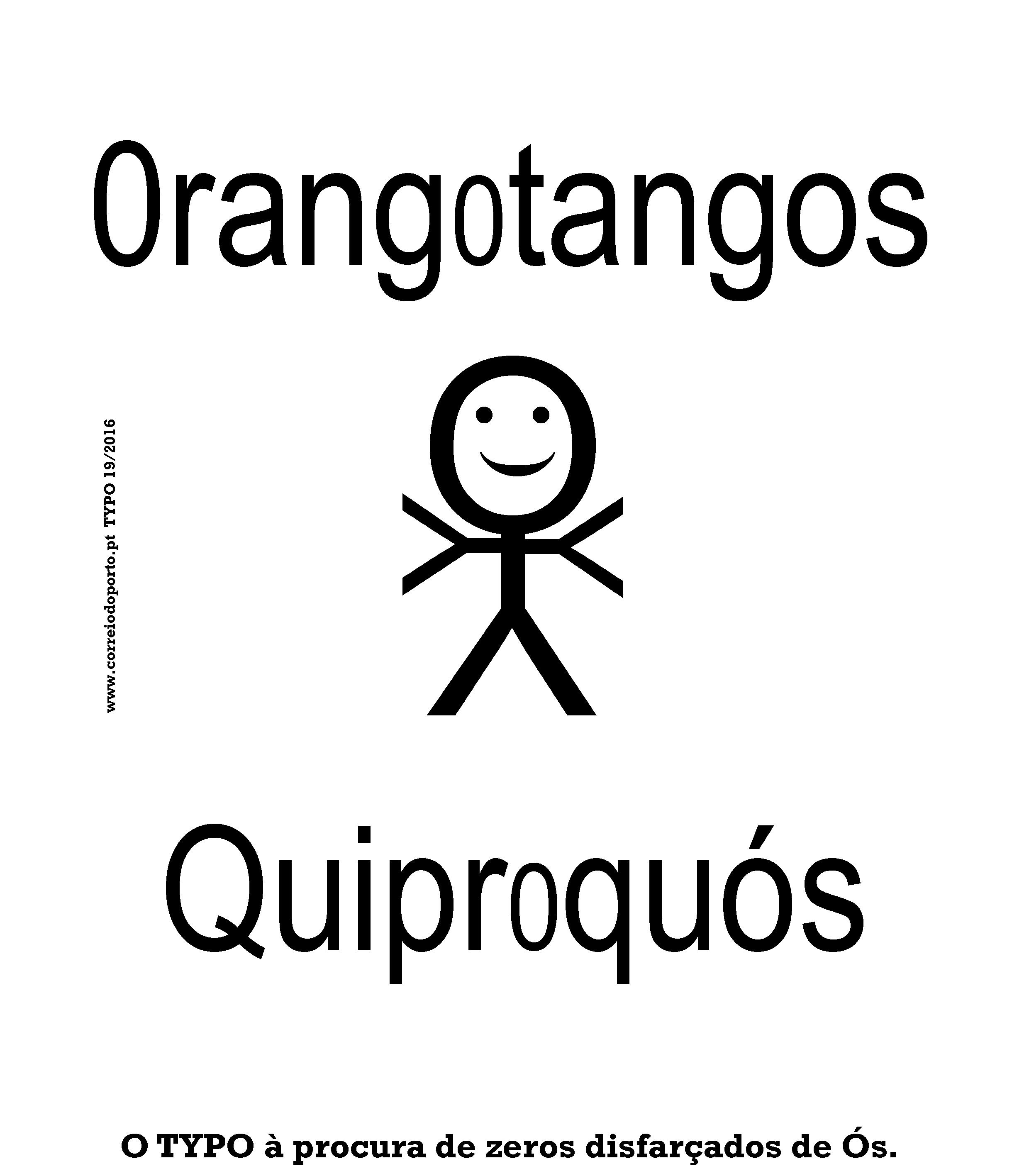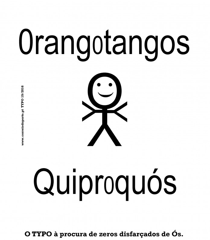 MEMÓRIA descritiva: O TYPO não gosta de confusões. É adepto da transparência. Cada coisa no seu lugar. No mundo da tipografia a troca de sinais dá origem a mal entendidos. É muito frequente, não se sabe porquê (dislexia?), o zero ocupar o lugar dos Ós, em especial nas palavras Orangotangos e Quiproquós. Por isso, hoje o TYPO anda à procura de zeros disfarçados de Ós. Há que repor a verdade no mundo da tipografia! No fim da caixa temos a legenda: O TYPO à procura de zeros disfarçados de Ós. da autoria de PML inspirado no conto O endireita de Edson Athayde.