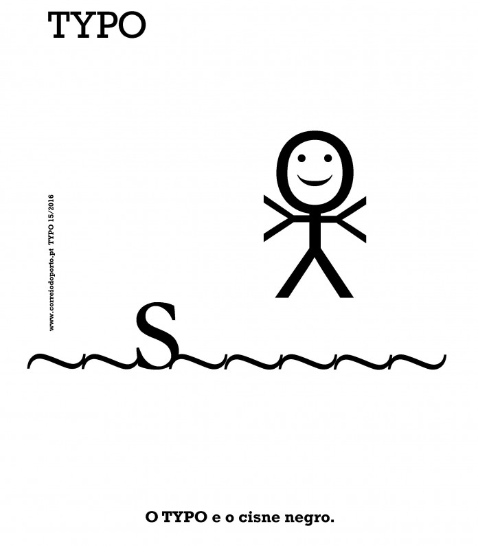 MEMÓRIA descritiva: O TYPO é um tipo imprevisível. Aparece onde menos esperamos. Umas vezes está no campo, outras na cidade. Tanto está a sobrevoar montanhas como a surfar no mar. Visita o hemisfério norte e depois surge no hemisfério sul como sucedeu hoje. Desta vez o TYPO foi à Austrália encontrar-se com o cisne negro: um ser imprevisível como ele. E aqui estamos nós a fabricar uma narrativa dando a ilusão que a presença do TYPO na Austrália era previsível. O cisne está representado por um S maiúsculo de fonte Garamond com tamanho 200 e as ondinhas do lago são tiles também em fonte Garamond com tamanho 140. No fim da caixa temos a legenda: O TYPO e o cisne negro. da autoria de PML inspirado na obra de Nassim Nicholas Taleb o Cisne Negro.