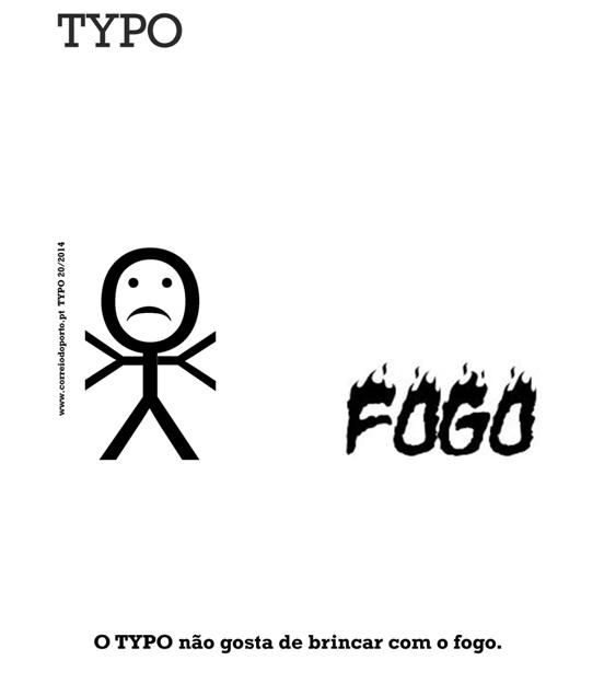 MEMÓRIA descritiva: O TYPO está sempre atento a tudo o que o rodeia. É o espírito de sobrevivência em ação (também existe no mundo dos sinais tipográficos). Se o TYPO nunca gostou de brincar com o fogo, depois de ter lido o último aviso da Autoridade Nacional de Proteção Civil, o TYPO ficou ainda com mais razões para não se aproximar dele. Afastado do TYPO (que está com cara de zangado) encontra-se o fogo em fonte Char BB e a arder (literalmente). No fim da caixa temos a legenda: O TYPO não gosta de brincar com o fogo. da autoria de PML
