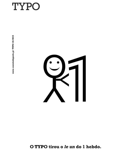 MEMÓRIA descritiva: As injustiças sucedem a todos, incluindo aos algarismos. Já não bastava serem descritos por extenso nos cheques com eles mesmo ali ao lado (uma ofensa gratuita para os números, mas vantajosa para a certeza e a segurança dos negócios, dizem), temos agora um semanário francês a encimar a cabeça do 1 com a sua descrição por extenso (le un[1]). Haverá maior ofensa para um algarismo? E logo vindo de quem vem!? (parece ser um semanário para intelectuais). O TYPO, em solidariedade com o 1, removeu da cabeça daquele a descrição supérflua. Ufa! Disse o 1. No fim da caixa temos a legenda: O TYPO tirou le un da cabeça do 1 hebdo. da autoria de PML